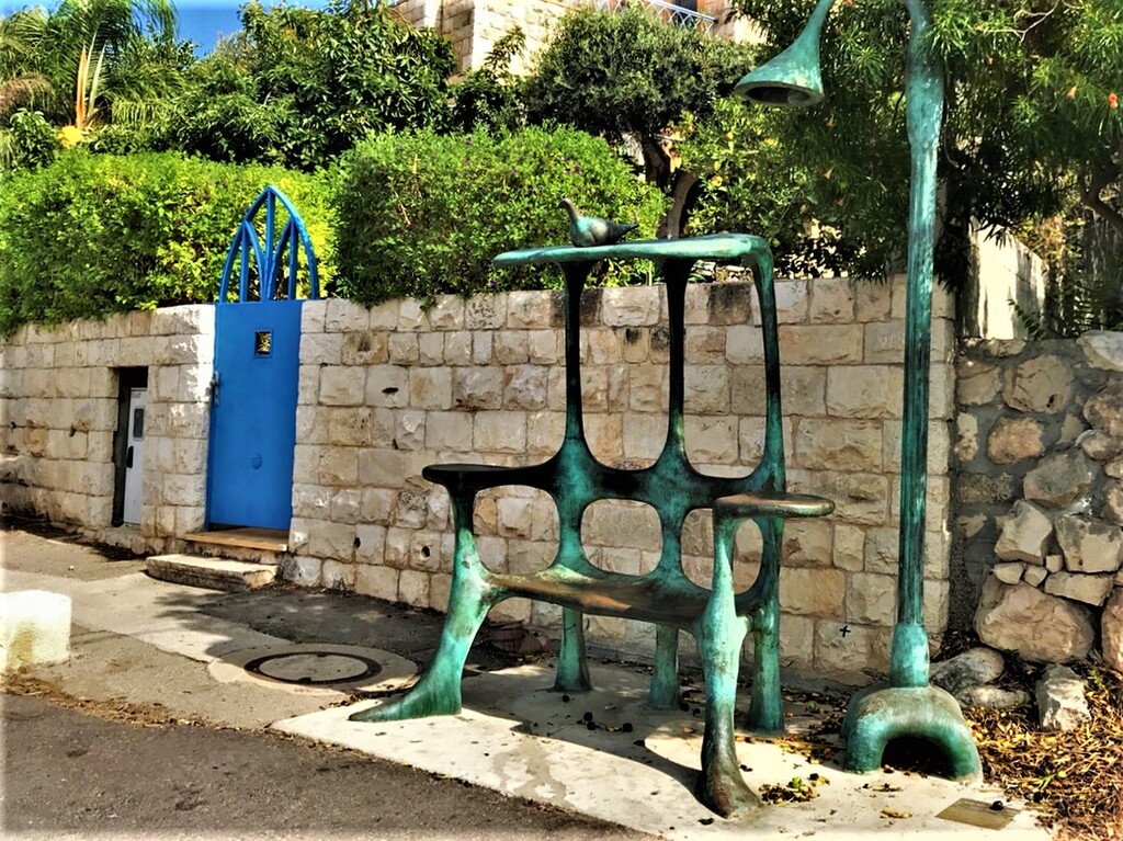 The distinctive bronze bus stop in Ein Hod has long functioned as a symbolic representation of the village. Featuring a sculptural bench supported by leg-like structures and complemented by an elegant lantern, it exudes both character and style. This imaginative and atypical piece of urban furniture embodies the unique architectural heritage and ambiance of Ein Hod, reflecting its artistic spirit and creative community.