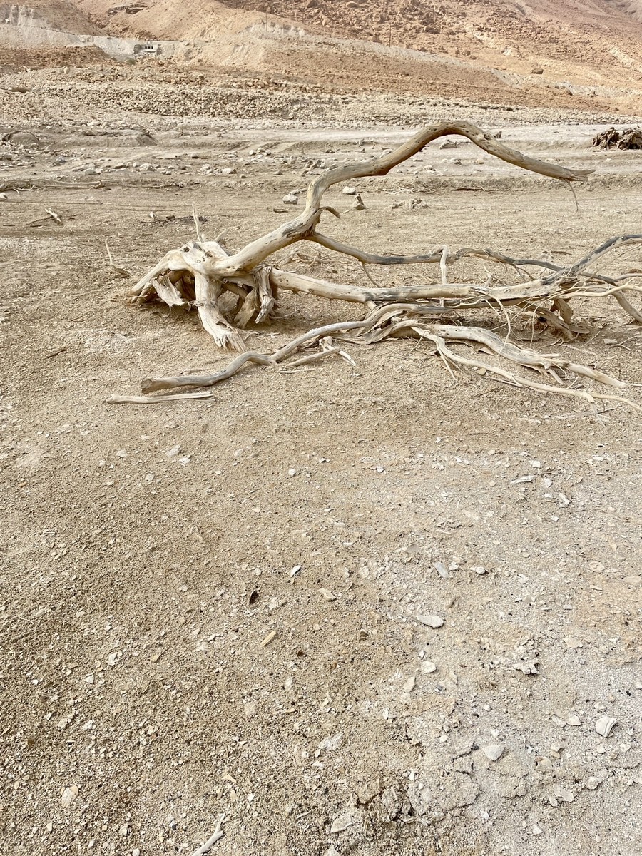 На отступившем побережье Мёртвого моря можно увидеть стволы деревьев, оставшихся там, где когда-то находилась линия берега. Эти стволы, погружённые в почву и укрепившиеся за долгие годы, стали естественным свидетельством колебаний уровня воды на протяжении веков.