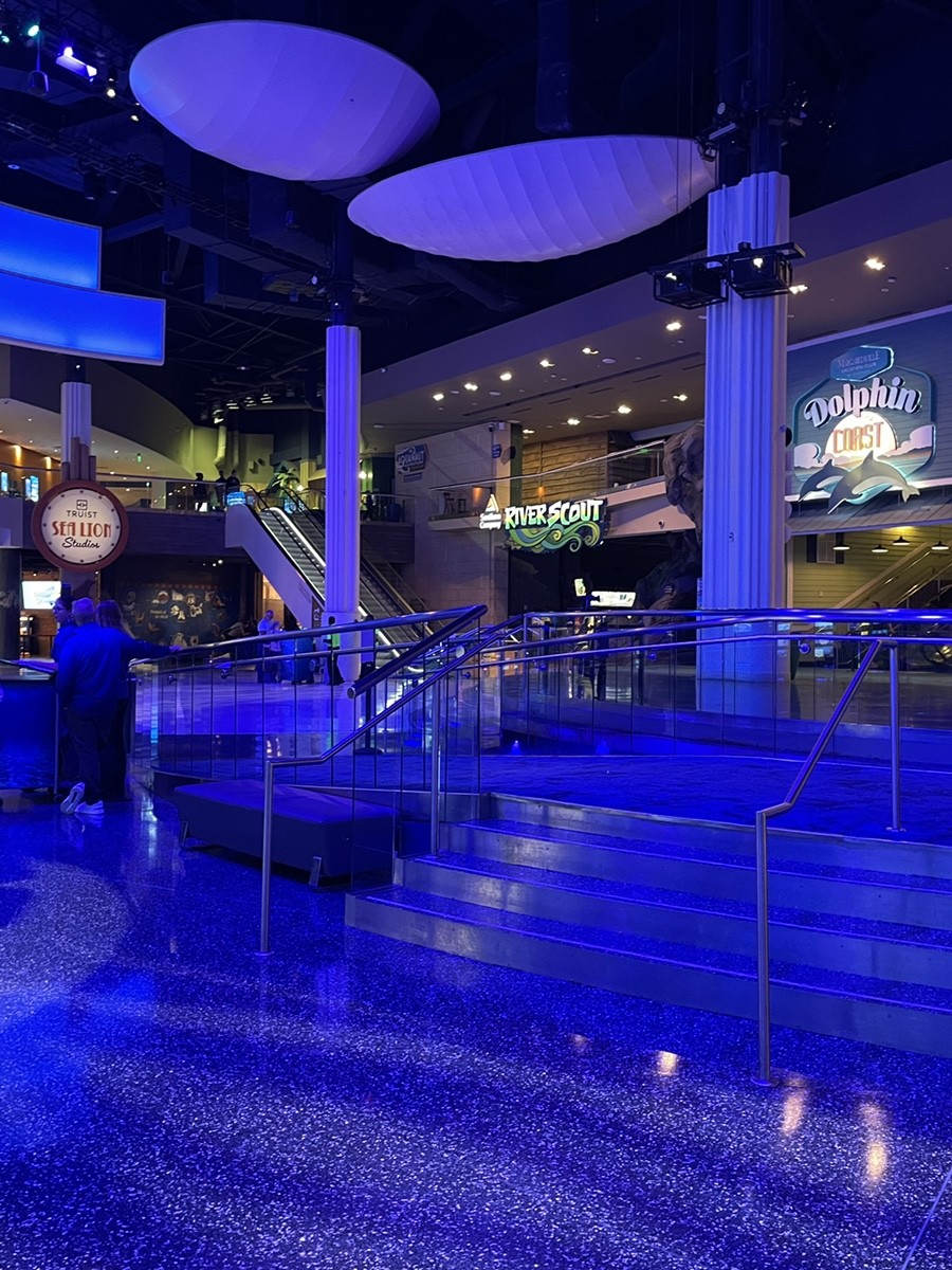 In the central atrium of the Georgia Aquarium, you feel less like you’ve entered a museum and more like you’ve stepped into a futuristic space terminal. The floor shimmers with ocean hues, soft blue lighting sets the mood, and signs guide visitors toward exhibits like Sharks!, Dolphin Coast, and River Scout, as well as cafés and theaters. From the very first steps, the design immerses you in a vast underwater world.