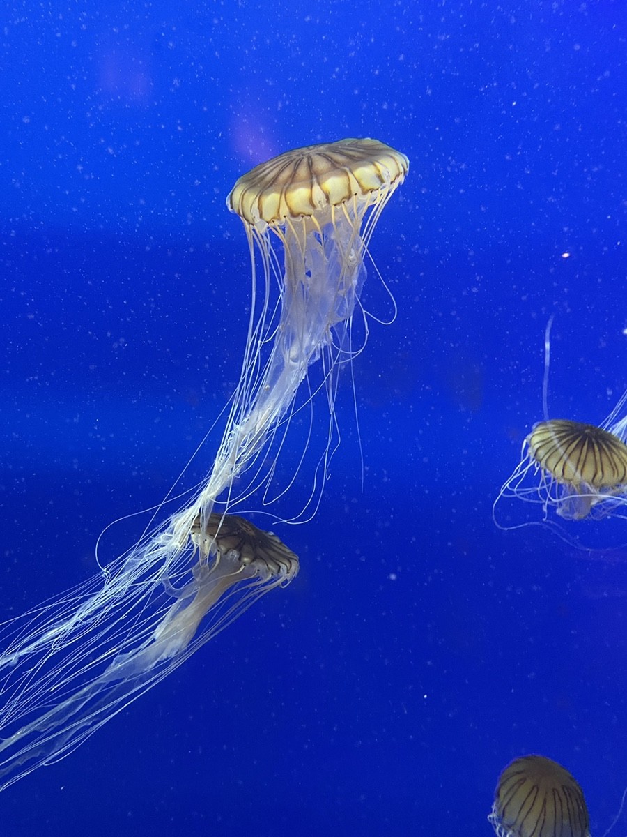 In front of the aquarium’s glowing blue wall, a slow-motion ballet unfolds — jellyfish drifting like beings from another world. Their fragile, transparent bodies look delicate, yet behind the beauty lies an ancient, brilliantly simple system for survival.