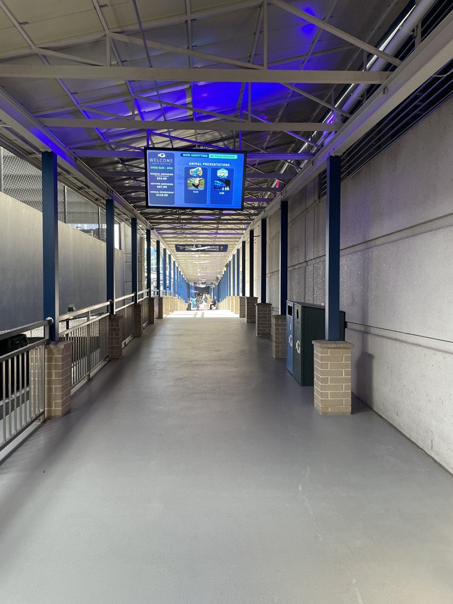 This covered walkway links the multi-level parking deck with Atlanta’s cultural heart — Pemberton Place. Along the way, signs point the direction: ticket counters to the left, the entrance to the Georgia Aquarium to the right. Digital boards display ticket prices and show schedules, so even the walk itself feels like the beginning of the experience.