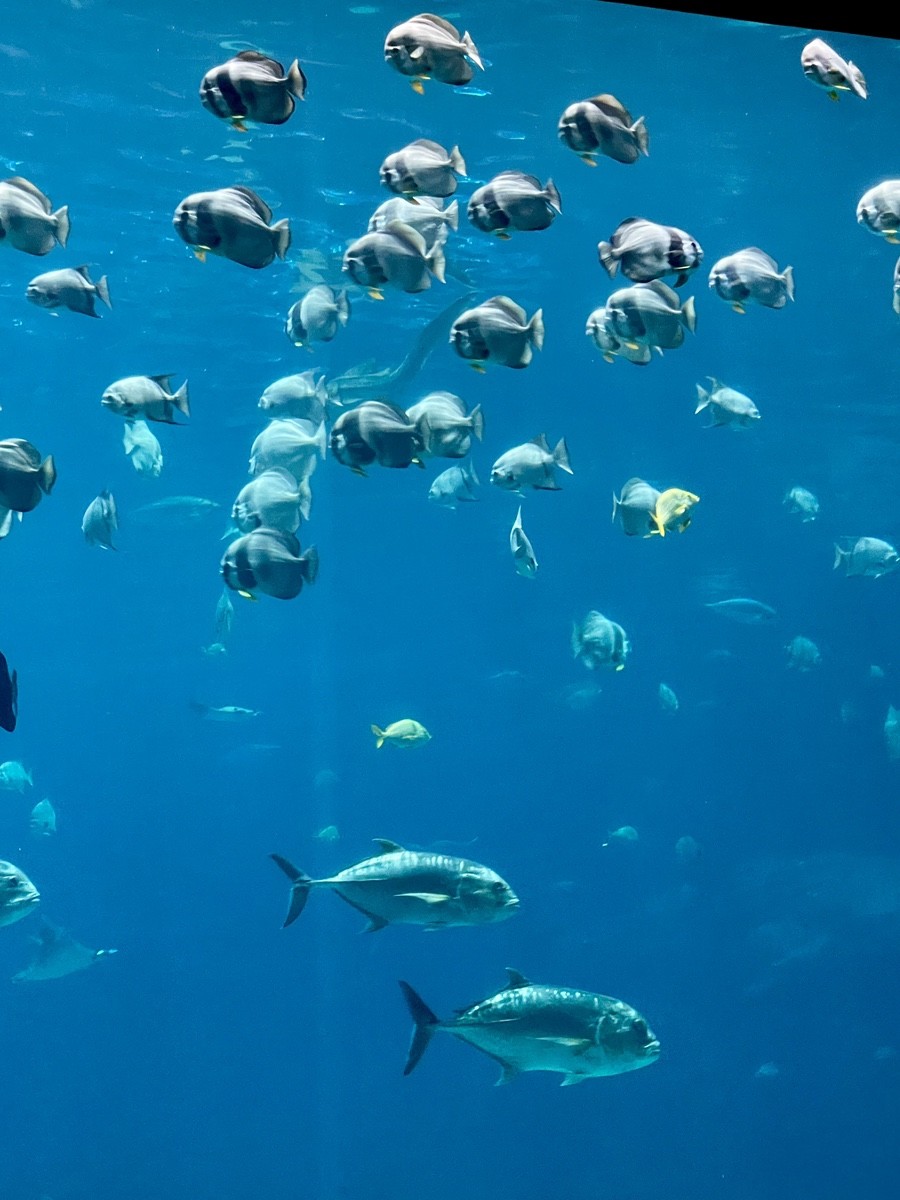 Schools of tuna and jacks flash silver in the blue light. In the wild, tuna can reach speeds of nearly 70 km/h, but here they move calmly, giving visitors a rare close look at their streamlined power. Their presence adds energy and motion to the scene.