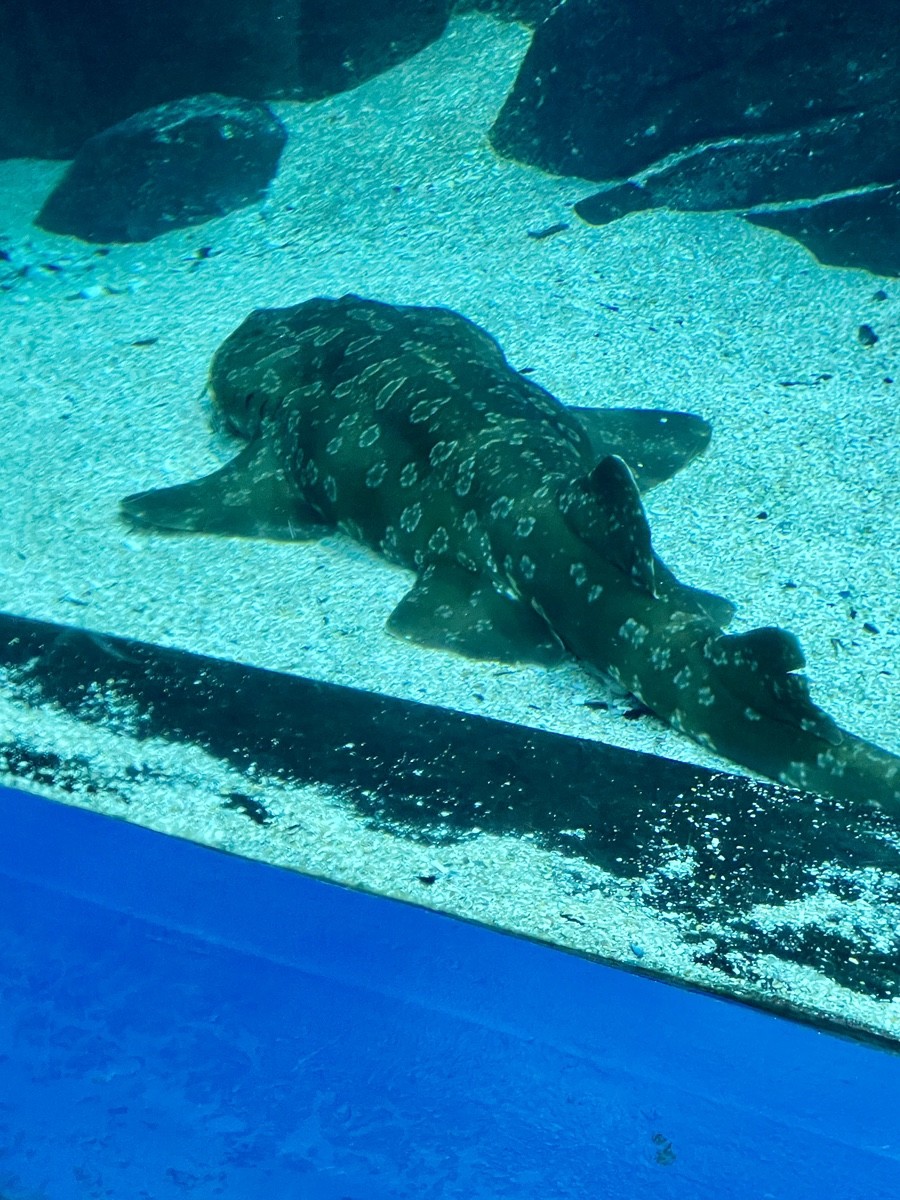 Inside the halls of the Georgia Aquarium, the ocean reveals itself in full. On the sandy floor rests a wobbegong shark, a flat-bodied predator patterned like the seabed. Perfectly camouflaged, it can wait motionless for hours, striking its prey in a split second.