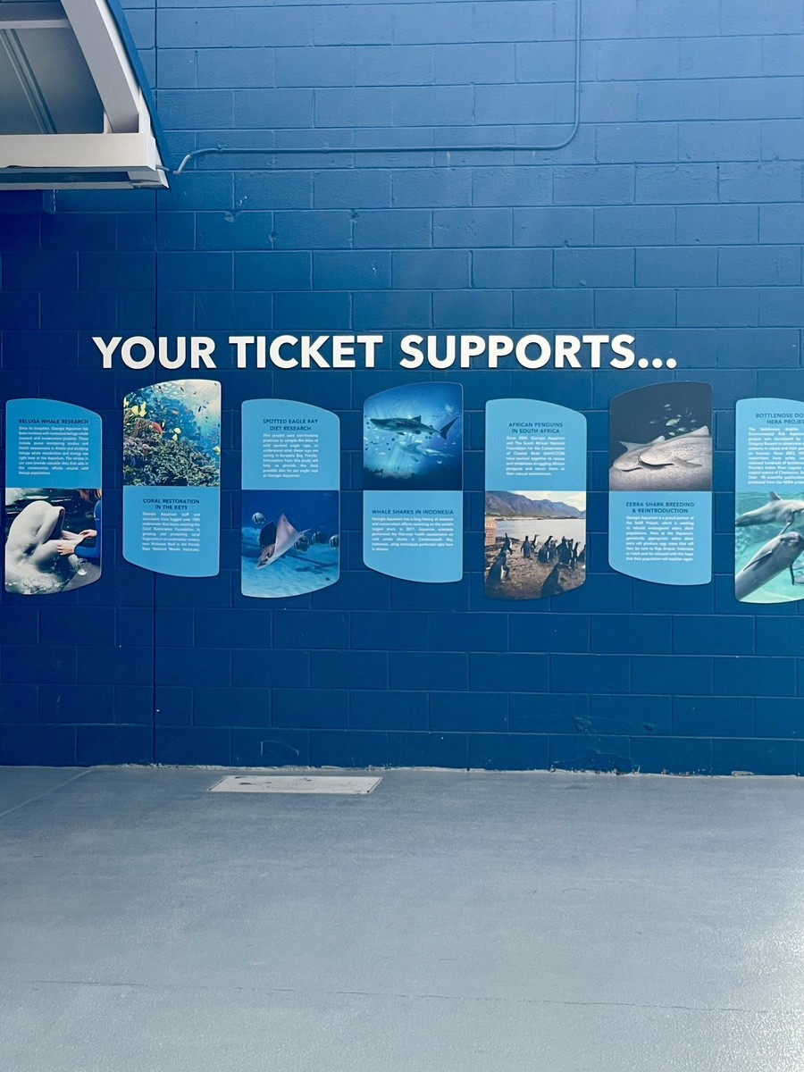 At the entrance, a striking blue wall carries the message “Your Ticket Supports…” — explaining how every purchase helps fund global conservation: coral reef restoration, beluga whale research in the Arctic, whale shark protection in Indonesia, and breeding programs for zebra sharks and African penguins. It’s a reminder that the aquarium is not just about entertainment but also about science and stewardship of the oceans.
