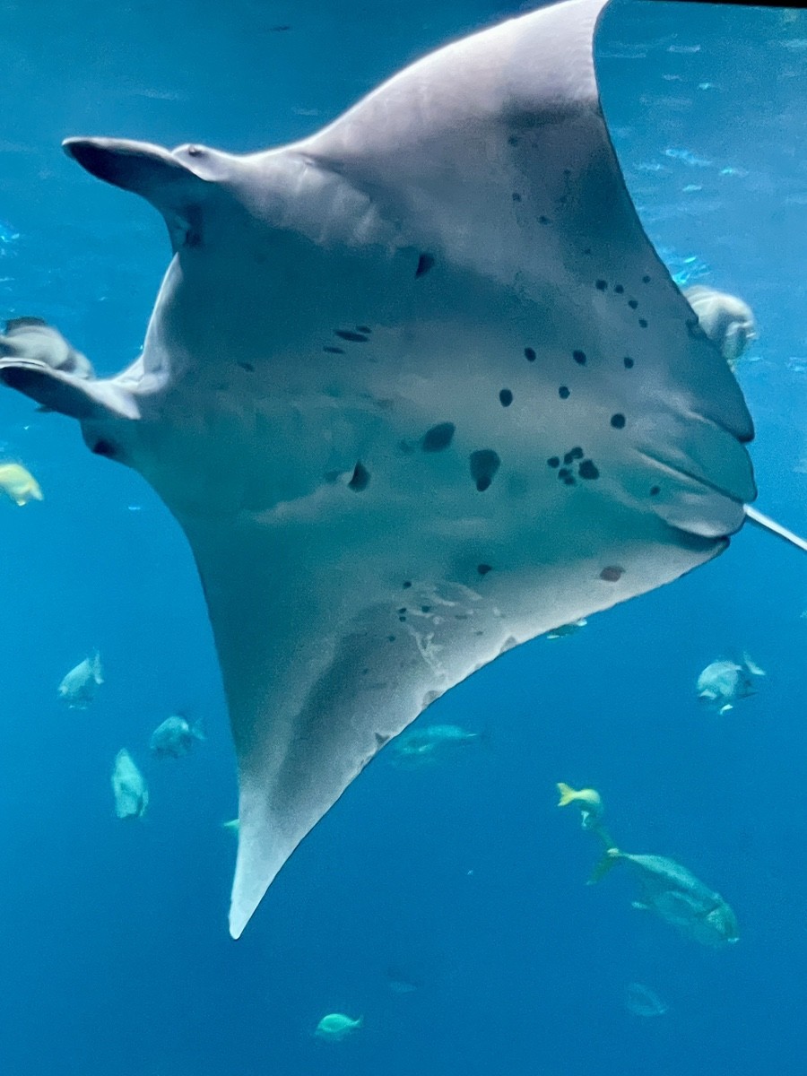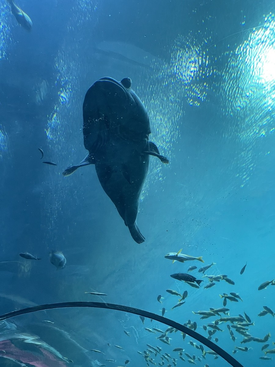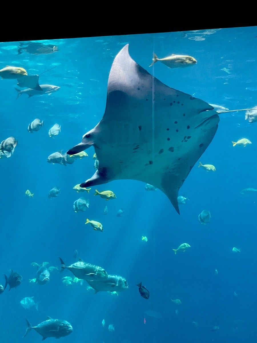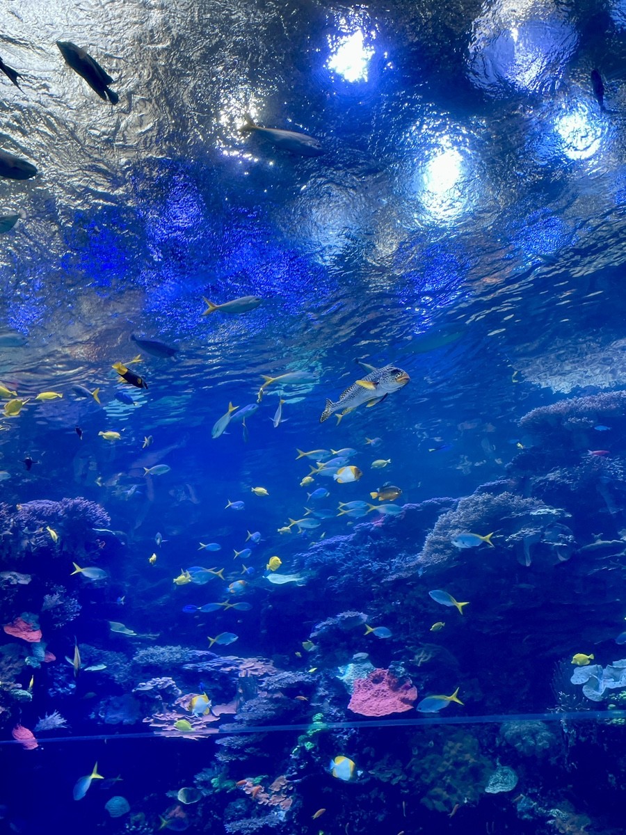 Walking through the transparent tunnel beneath the water, visitors find themselves surrounded: mantas soar overhead, tuna dart past, and a whale shark glides slowly by. For a moment, it feels as though you’ve stepped inside the ocean itself.