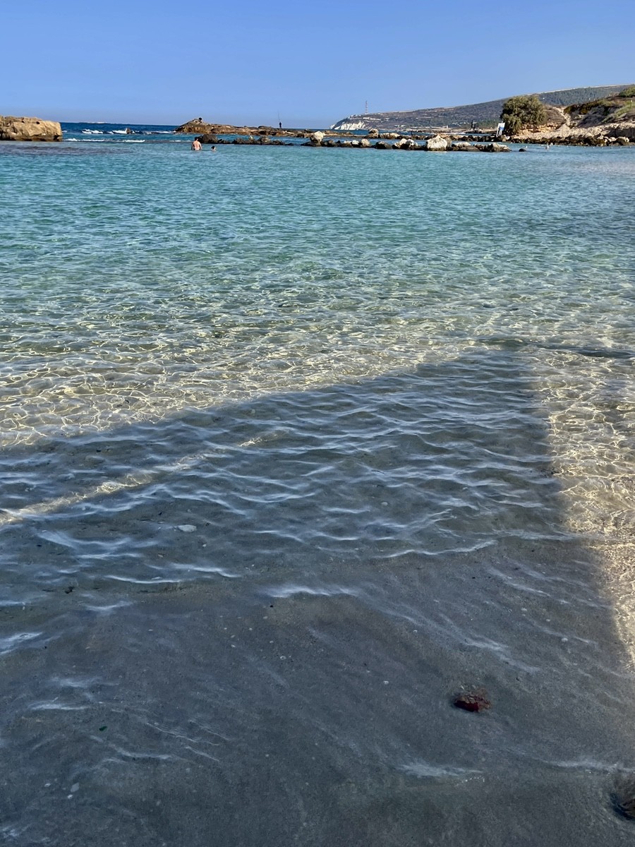 Бирюзовая вода бухты Ахзива кажется почти нереальной — спокойная, прозрачная, она мягко омывает песчаное дно, где едва различимы маленькие пучки розовых водорослей между камнями. Здесь безопасно и приятно купаться: море неглубокое, а дно ровное и мягкое, без острых камней. В воде резвятся крошечные рыбки — те самые, что иногда щекотно покусывают кожу на ногах. Это местные виды, живущие по всему побережью Израиля, включая заливы Хайфы, Кейсарии и Ашкелона. Они не опасны — просто ищут микроскопические частички пищи, очищая кожу от омертвевших клеток, как в природном спа.