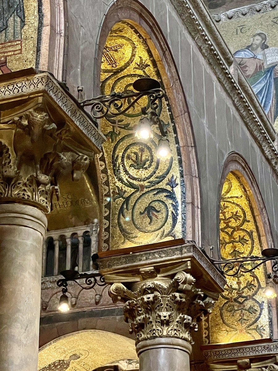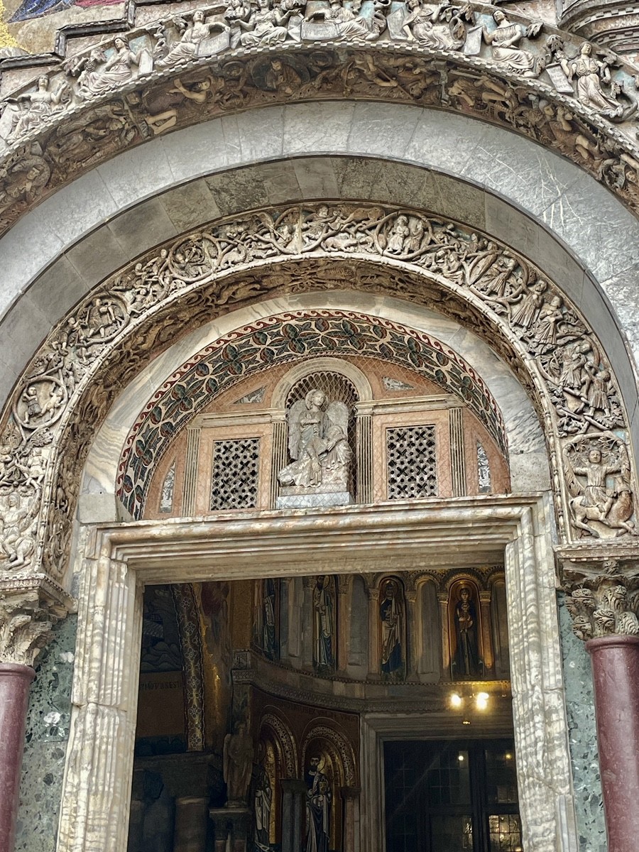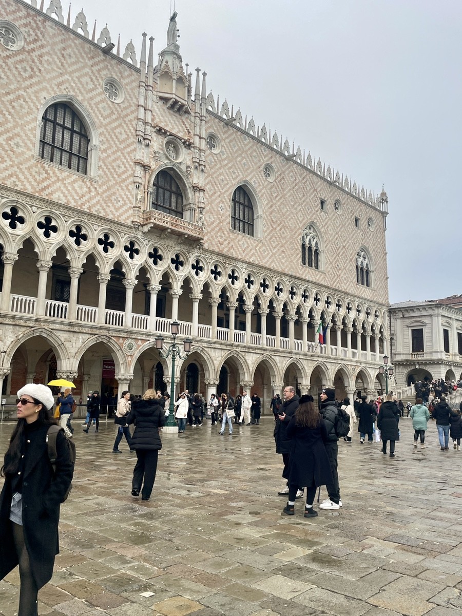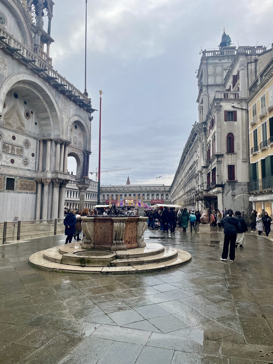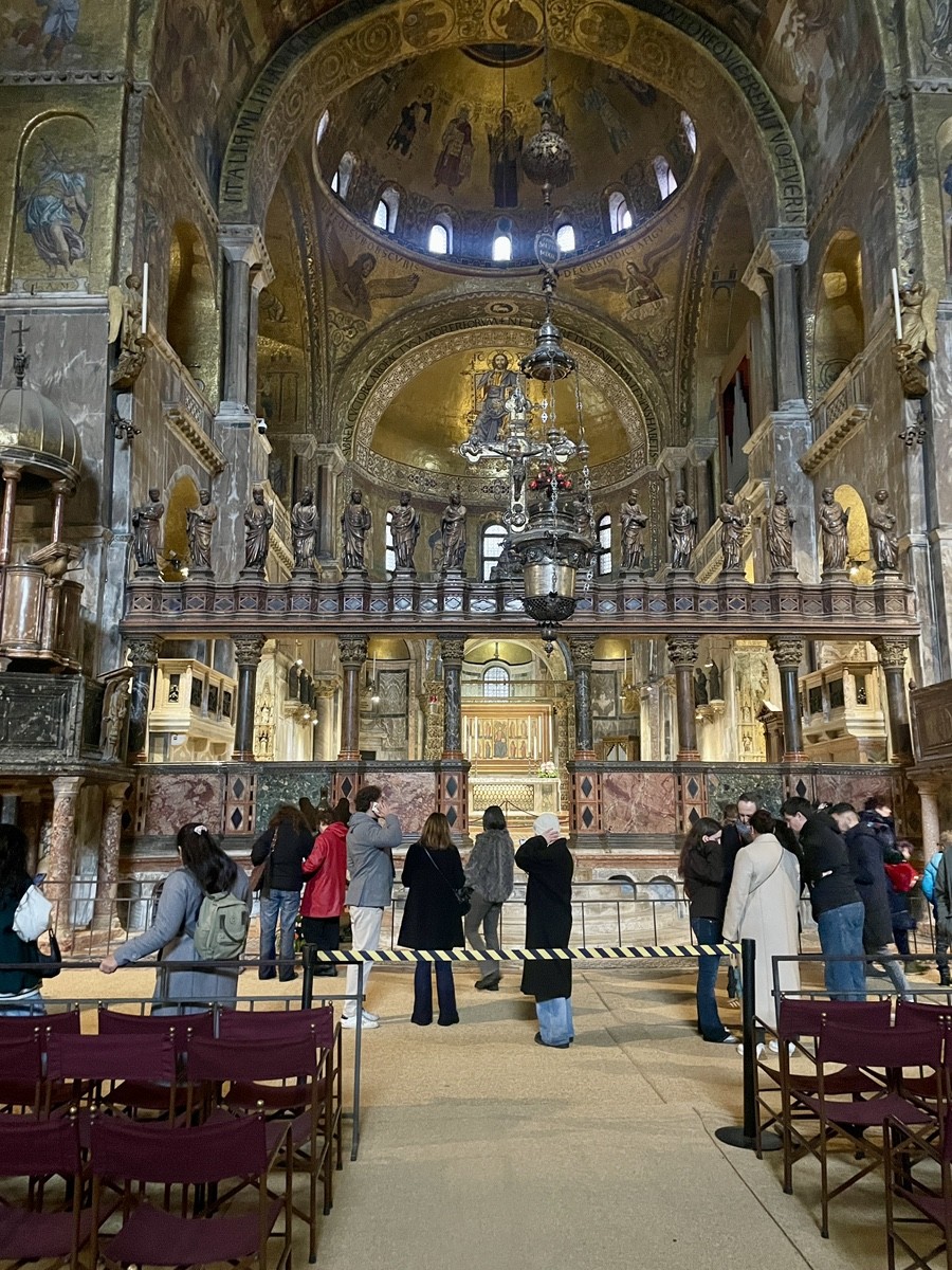 Кульминация маршрута на площади Сан-Марко — в месте, где вода лагуны встречается с камнем и где карнавал, дождь и архитектура создают ощущение живой сцены. Отсюда путь ведёт внутрь St. Mark’s Basilica — храма, который веками собирался как драгоценная шкатулка из трофеев и историй: византийские колонны, мозаики из золотой смальты, алтарь Пала д’Оро, баптистерий дожей и тихие трансепты, где до сих пор чувствуется дыхание раннего христианства.