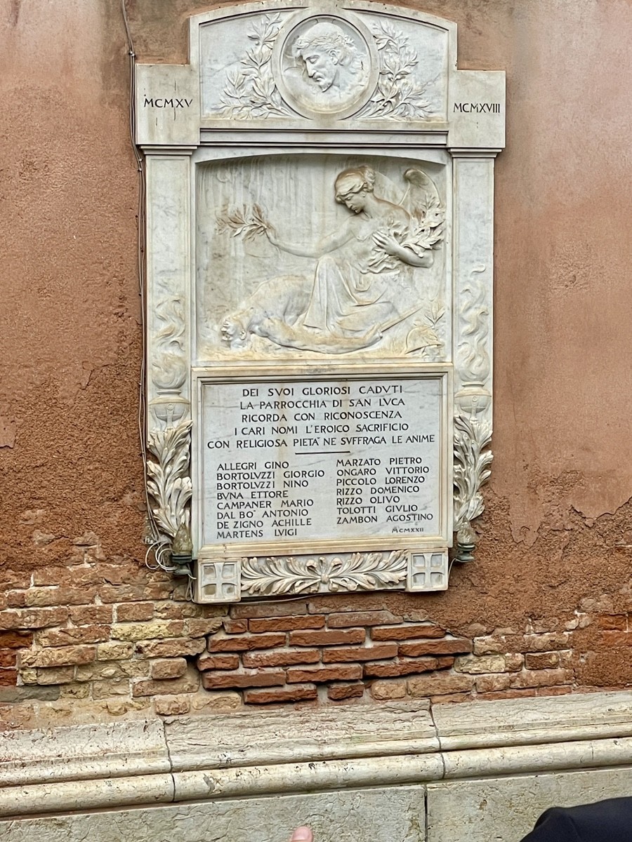 Символично что место для этого барельефа выбрали именно на стене дома последнего дожа Венеции - Лодовико Манини (Ludovico Manin). Его правление завершилось в мае 1797 года, когда под давлением ультиматума Наполеона Бонапарта Великий совет проголосовал за ликвидацию независимости республики, существовавшей более тысячи лет. 12 мая 1797 года, Лодовико Манин снял с головы корно (знаменитую шапку дожа) и передал её своему слуге со словами: