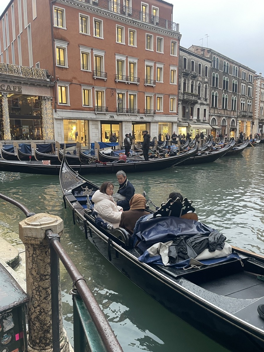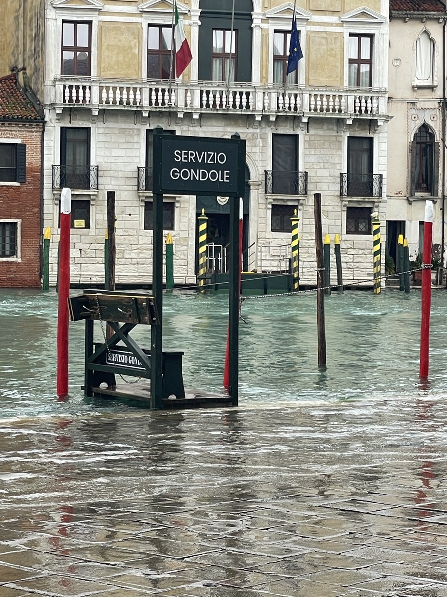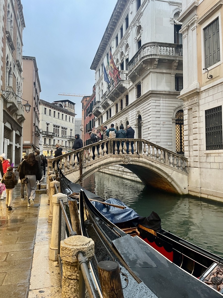 Аква Альта: Когда город уходит под воду Это классическая Acqua Alta (высокая вода). Видно, как уровень Гранд-канала практически сравнялся с мостовой, и вода начинает заливать знаменитые серые плитки — masegni. Если бы вода поднялась еще на 10-20 см, на этих фото мы бы увидели passerelle — длинные деревянные настилы, по которым венецианцы ходят над водой, чтобы не промочить ноги (хотя высокие резиновые сапоги здесь — главный аксессуар сезона). Стойка с надписью «Servizio Gondole» выглядит почти сюрреалистично, когда вода подступает к самой скамейке. В такие моменты обычные прогулочные гондолы часто делают паузу, так как из-за высокого уровня воды они просто не могут пройти под низкими мостами. Но Трагетто: Переправа за два евро всегда к услугам. Поскольку мостов через Гранд-канал всего четыре, а он очень длинный, венецианцы веками используют трагетто. Это большая гондола, которой управляют два гребца. Для туристов переправа стоит 2 евро (для местных с картой Venezia Unica — еще дешевле), в то время как стандартная прогулка на гондоле обойдется минимум в 90-110 евро. Поездка длится всего пару минут. Местные жители обычно едут стоя, демонстрируя чудеса равновесия, но туристам разрешают присесть. Прямо рядом с рыбным рынком Риальто находится одна из самых популярных стоянок трагетто — Santa Sofia. Она перевозит людей на другую сторону канала, к району Каннареджо.