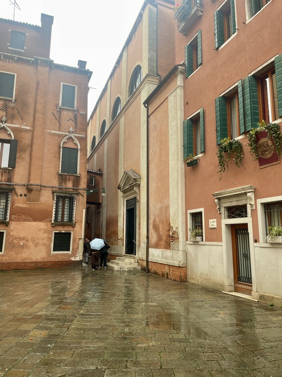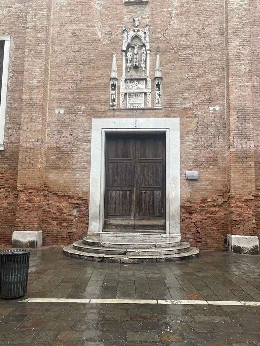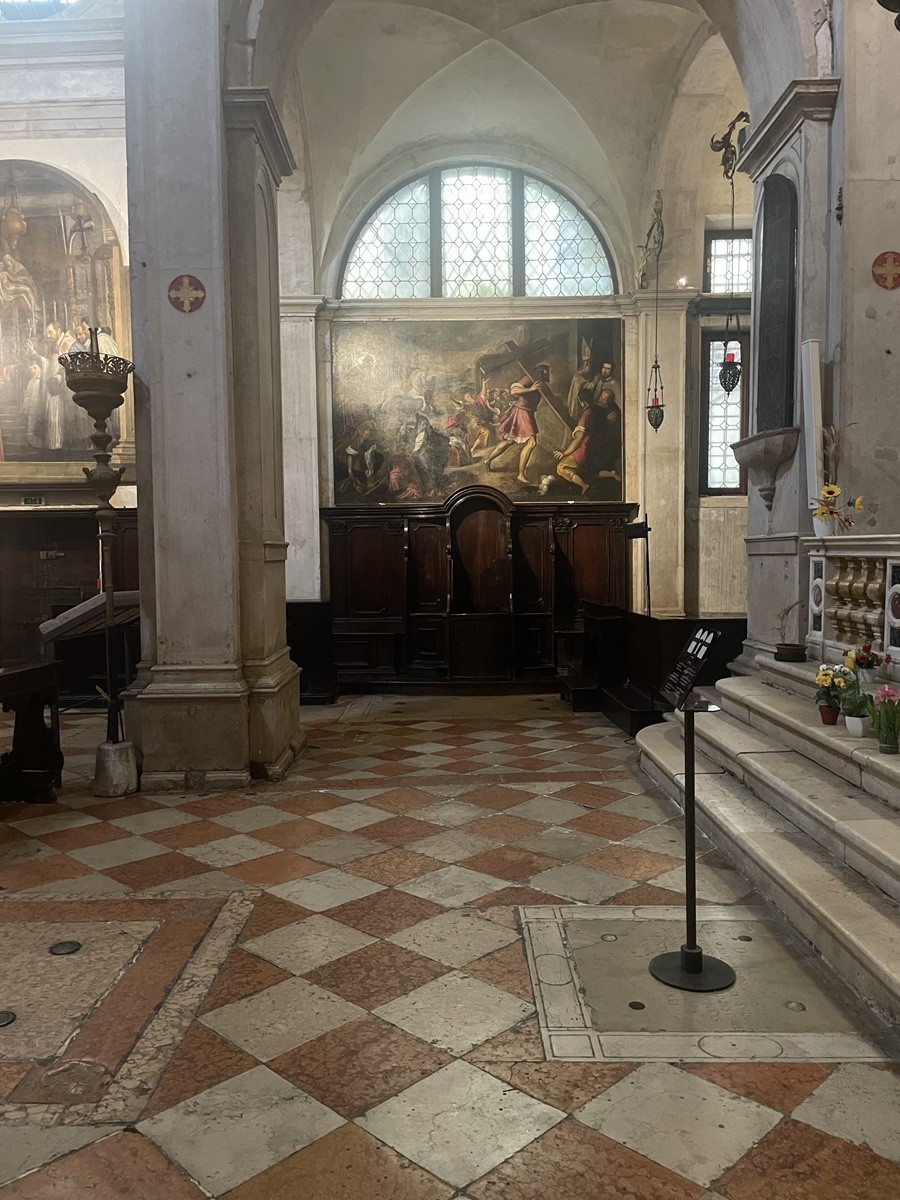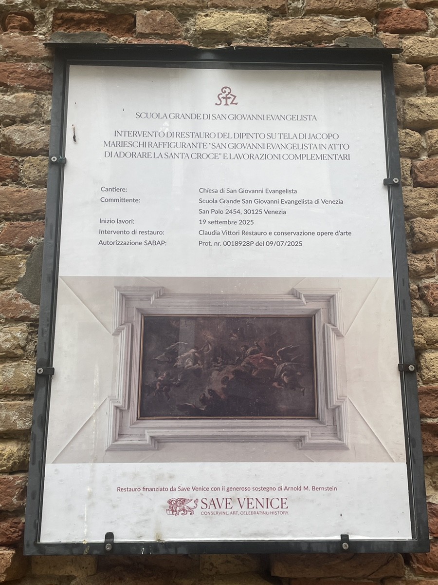 За монументальным порталом Ломбардо открывается камерный двор — Campiello de la Scuola. Вход в саму церковь (Chiesa di San Giovanni Evangelista). Над дверью — бюст святого покровителя, который словно приглашает зайти внутрь, но венецианская сдержанность требует соблюдения правил: вход возможен по предварительной брони или в часы работы самой Скуолы. Если нам удастся заглянуть внутрь, перед нами предстанет интерьер, где архитектура и живопись сливаются в единое литургическое пространство. Церковь сохранила свою структуру, несмотря на многократные перестройки. Обратите внимание на стройные арки и перспективу, ведущую к главному алтарю — это пространство было создано, чтобы подчеркнуть торжественность церемоний Братства. Якопо Мариески, художник XVIII века, изобразил ключевой момент истории этого места: «Святой Иоанн Евангелист в акте поклонения Святому Кресту». Проект по восстановлению его работы финансируется организацией Save Venice — международным фондом, который десятилетиями спасает искусство города от влаги и времени. Картина Мариески — это художественное эхо того самого дара Филиппа де Мезьера, о котором мы говорили. Даже спустя столетия после прибытия реликвии с Кипра, художники продолжали воспевать её, создавая новые слои легенды. Этот комплекс — не застывший музейный экспонат. Это живой организм, где сегодня мастера-реставраторы бережно восстанавливают мазки кисти Мариески, а современные венецианцы продолжают поддерживать традиции одного из древнейших братств мира. Здесь, среди кирпичных стен Сан-Поло, история не заканчивается — она постоянно обновляется, слой за слоем.