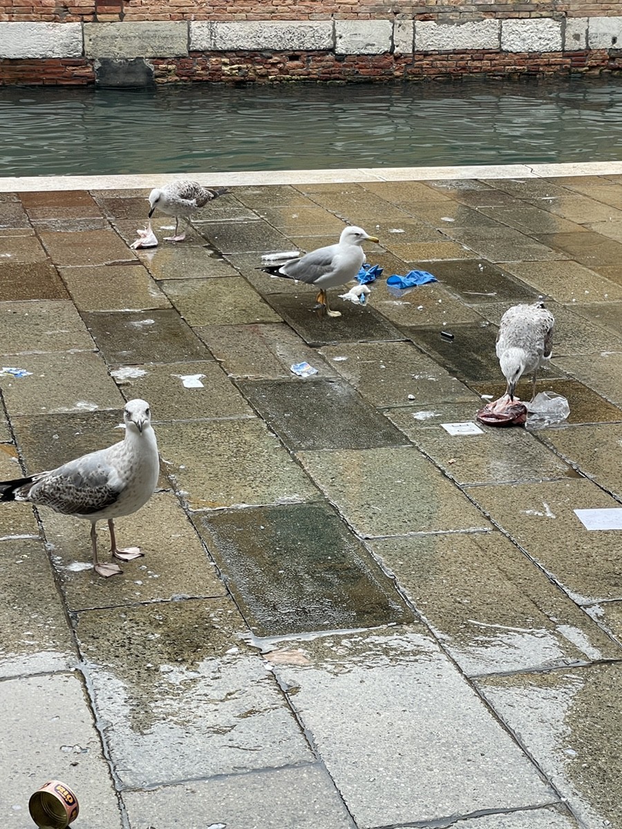 Рыбный рынок на этом месте существует уже около 800 лет. На стенах зданий рядом с рынком до сих пор сохранились старинные мраморные таблицы, на которых высечены минимально допустимые размеры рыб для продажи в XI-XV веках. Если рыба была меньше «государственного стандарта», торговца штрафовали. Так венецианцы заботились о сохранении популяции в лагуне еще в Средние века. Несмотря на «древний» вид, это здание построили в 1907 году, но строго по старинным чертежам, чтобы сохранить дух города. Эти птицы — типичный «санитар» Венеции — средиземноморская чайка (Larus michahellis), которая лакомится остатками дневного улова. Рынок работает с раннего утра и примерно до часу дня. Как только торговцы начинают сворачиваться и мыть каменные прилавки из шлангов, наступает «час чаек». Бесплатный шведский стол — рыбьи головы и хребты — это результат филигранной работы венецианских торговцев рыбой (pescivendoli). Они разделывают рыбу прямо на месте для местных жителей и ресторанов, а остатки выбрасывают или оставляют птицам. Рынок Риальто спроектирован так, чтобы его было легко мыть морской водой. Уклон пола и система желобов позволяют быстро смывать чешую и потроха прямо в каналы, где их уже поджидают рыбы покрупнее или такие вот чайки. Длинный хребет - это остатки морского черта (coda di rospo) или крупного сибаса, которые очень популярны в венецианской кухне. Местные чайки — гурманы. Они настолько привыкли к рынку, что могут начать воровать рыбу прямо с прилавка, если продавец отвлечется.