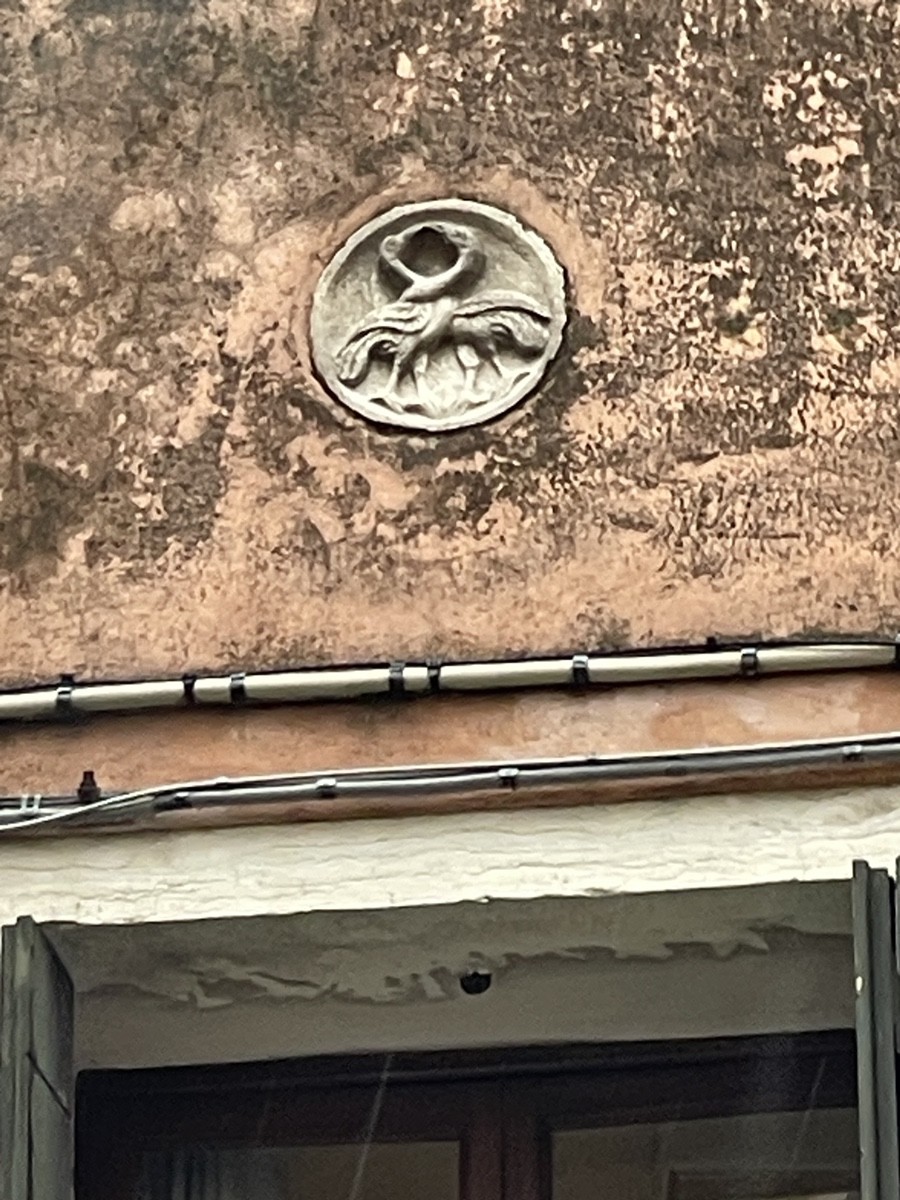 Когда вы переходите мостик и попадаете на Rio Terà (бывший канал, засыпанный землей для удобства горожан), вы видите на домах каменные диски — патеры. Это своего рода «паспорта» зданий. Аббревиатура «S C»: Это знак принадлежности к Scuola Grande di San Rocco (Скуола Гранде ди Сан-Рокко). В Венеции «скуолы» были богатейшими благотворительными братствами. Буквы на фасаде означали, что этот дом — собственность Скуолы, а доход от аренды идет на содержание больниц и помощь беднякам. Пеликан, кормящий птенцов: Это главный символ милосердия. Древняя легенда гласит, что пеликан разрывает свою грудь, чтобы накормить голодных птенцов собственной кровью. Для Скуолы Сан-Рокко, которая помогала больным во время чумы, этот образ Христа и самопожертвования был программным.