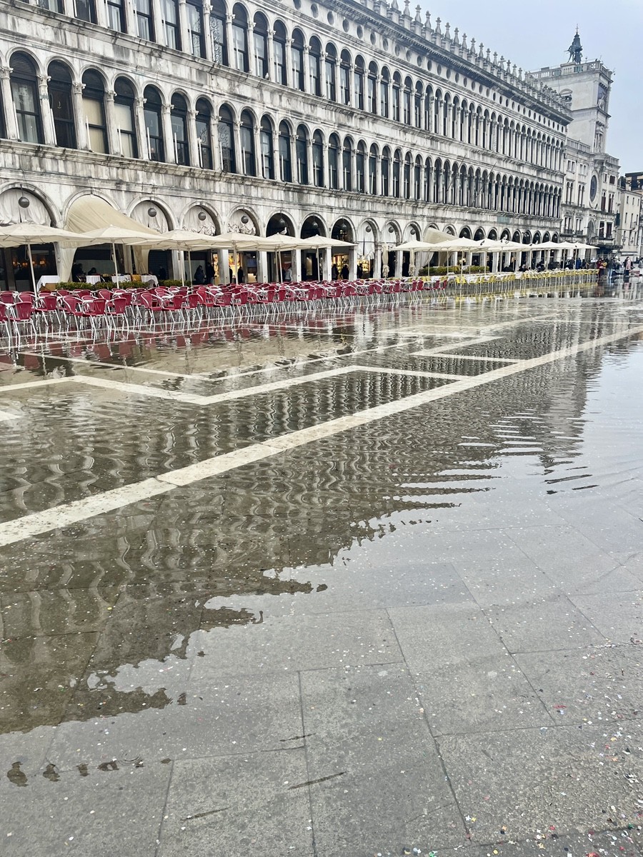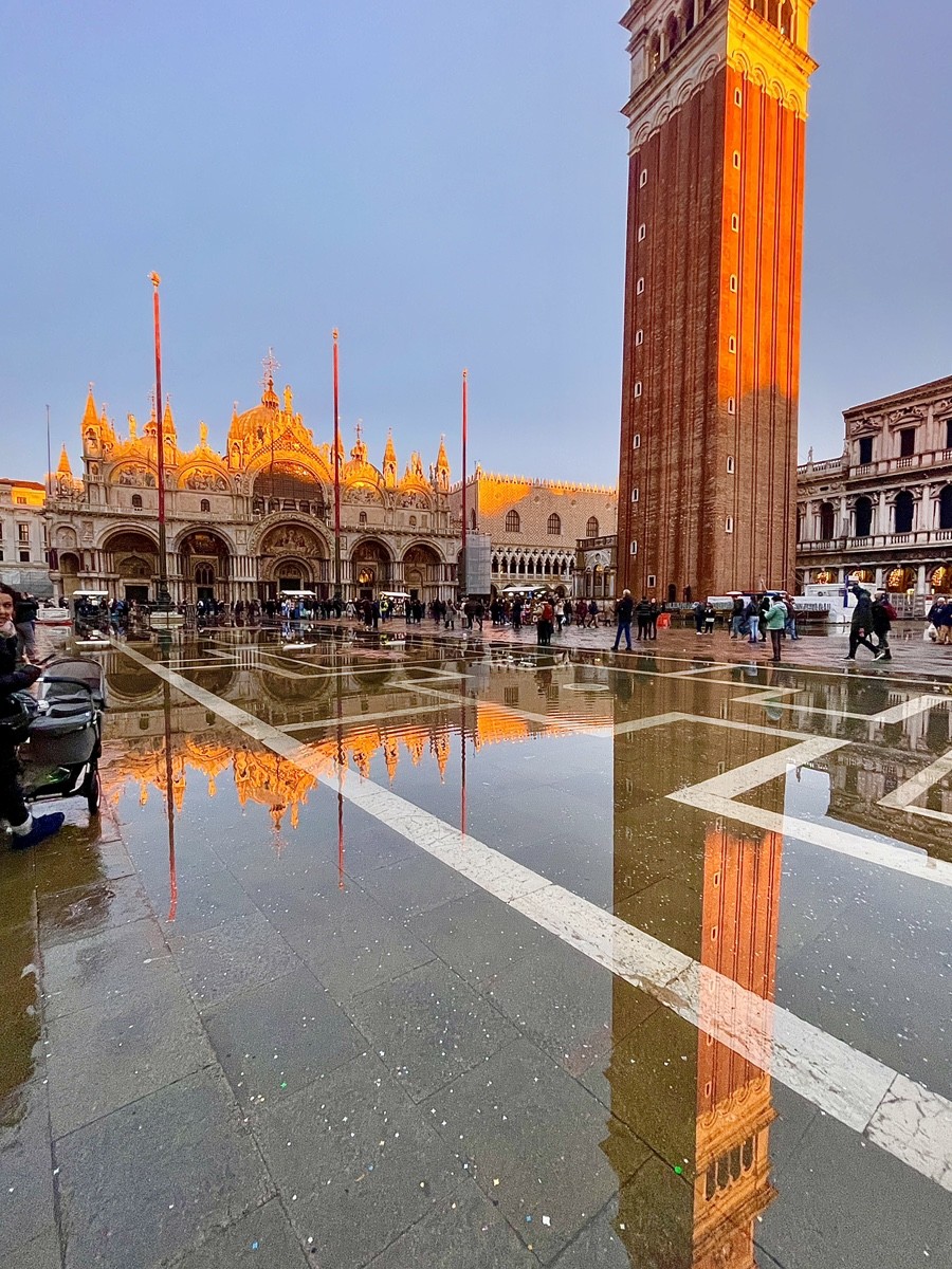 Зеркало площади: Посмотрите на отражение Кампанилы в лужах. Это редкий кадр: обычно площадь либо сухая, либо полностью затоплена (Acqua Alta), а здесь вода лежит тонкими пластами, создавая идеальный эффект удвоения реальности.