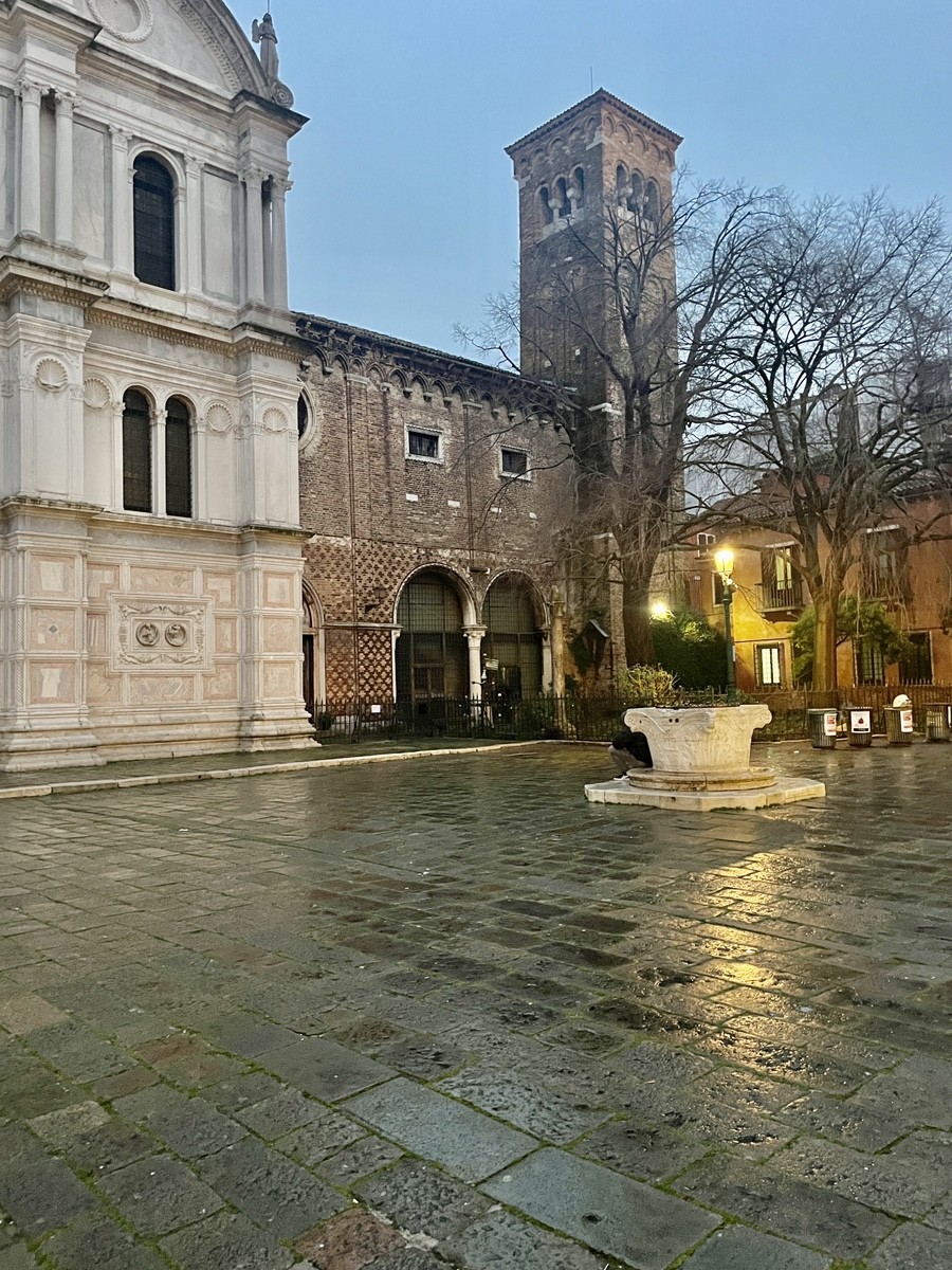 Атмосфера: Обратите внимание на мокрый камень — «синий час» делает отражения фонарей на брусчатке почти золотыми. Туристы с чемоданами напоминают, что этот район — один из самых популярных для жизни, так как он находится в двух минутах от Сан-Марко, но сохраняет тишину монастырского двора.