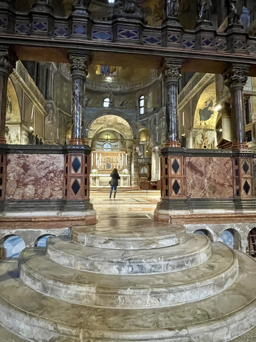 Затопленная крипта: Это «визитная карточка» церкви. Из-за подъема уровня воды крипта, где покоятся восемь ранних венецианских дожей, почти всегда затоплена. Колонны стоят в зеркальной воде — зрелище мистическое и немного жуткое.