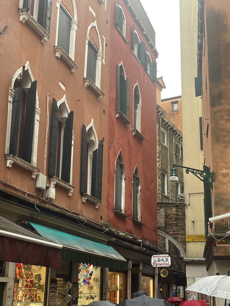 Прямо напротив входа в Сан-Джованни Элемозинарио, на стене обычного венецианского дома, находится этот замечательный рельеф с изображением Святого Георгия, поражающего змея. В Венеции такие изображения на фасадах домов часто служили «вывесками» для профессиональных объединений (скуол) или благотворительных организаций. Здесь находилось представительство Scuola di San Giorgio (не путать с большой скуолой Сан-Джорджо-дельи-Скьявони). Поскольку церковь Сан-Джованни Элемозинарио была центром рыночной жизни Риальто, гильдии старались закрепить за собой пространство буквально в метре от входа в храм. Здание с логотипом банка UniCredit, — это яркий пример того, как Венеция впитывала разные стили. Обратите внимание на балюстраду на крыше — это классическая венецианская терраса (altana), где жители веками сушили белье или осветляли волосы на солнце. Это здание стоит на пересечении важнейших торговых путей Риальто. Проход справа от него ведет к знаменитому мосту, а слева — в самую гущу овощного и рыбного рынков. Арка, которую видно в глубине справа на первом фото, — это Sottoportico di Rialto. Раньше под такими сводами располагались меняльные лавки (первые банки Европы). То, что вы видите банк именно в этом месте сегодня — забавная историческая преемственность. Деньги в этом конкретном квадрате Венеции «крутились» еще с XII века.