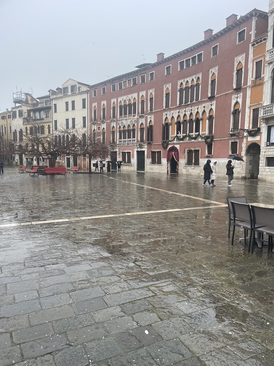 Мы запечатлели уникальное состояние площади — Acqua Alta (высокая вода). Геометрический узор пола с белыми звездами, залитый водой, превращается в сюрреалистическое зеркало. Отражение муранской люстры в виде зеленой виноградной грозди на мокром камне выглядит как драгоценный камень, впаянный в пол. Обратите внимание на люстры. Эти грозди — дань уважения мастерам острова Мурано. В мартовской Венеции 2026 года их свет, дробящийся в лужах, создает тот самый «золотой» уют, который спасает от сырости и холода лагуны.