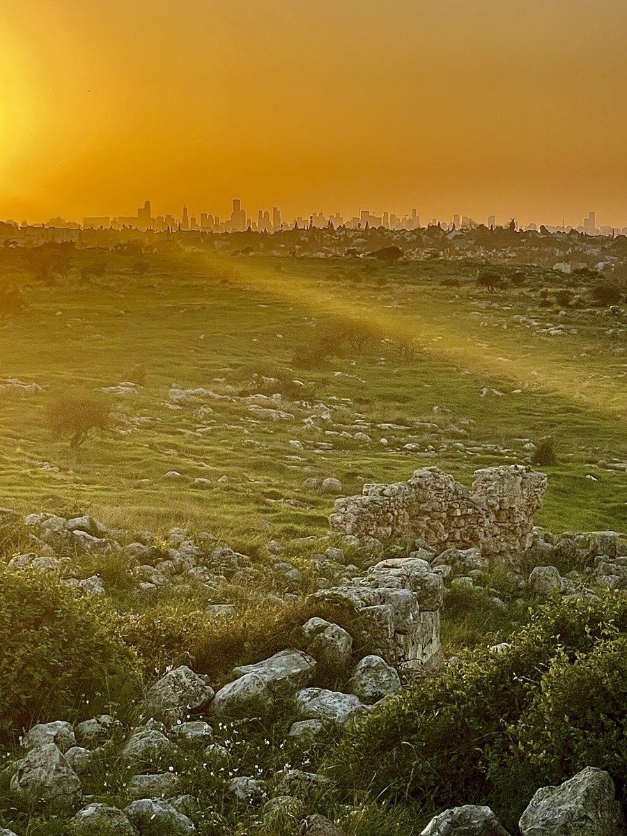 Самое удивительное в этом пейзаже — резкий контраст. На переднем плане, прямо у ваших ног, простираются темнеющие, дикие поля, поросшие высокой травой и тем самым желтым крестовником, который вы видели. Трава уже не ярко-зеленая, как днем, а приобретает глубокие, оливковые и бронзовые тона, уходя в тень. А далеко на горизонте, сквозь эту золотую дымку, проступает силуэт Тель-Авива. Небоскребы выглядят как темные, четкие зубцы на фоне пылающего неба. Город кажется далеким, почти нереальным, подчеркивая дикую уединенность места, где вы находитесь.