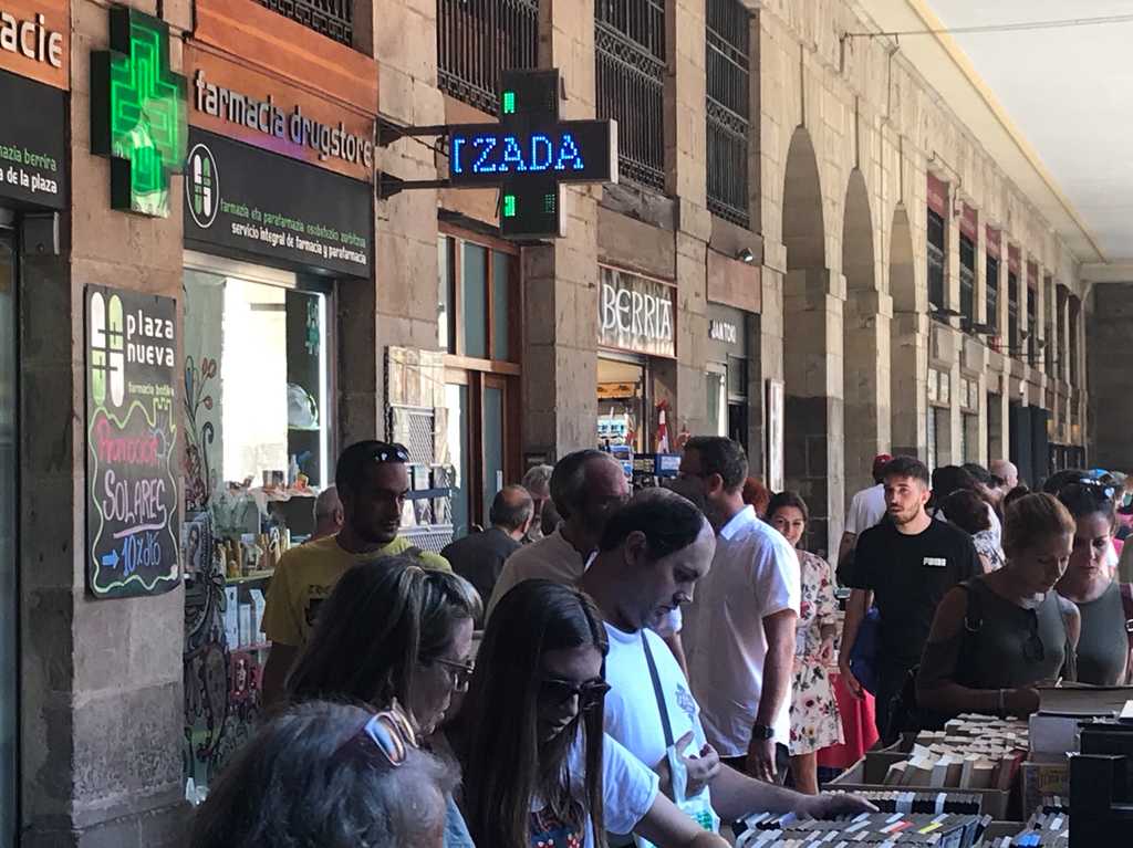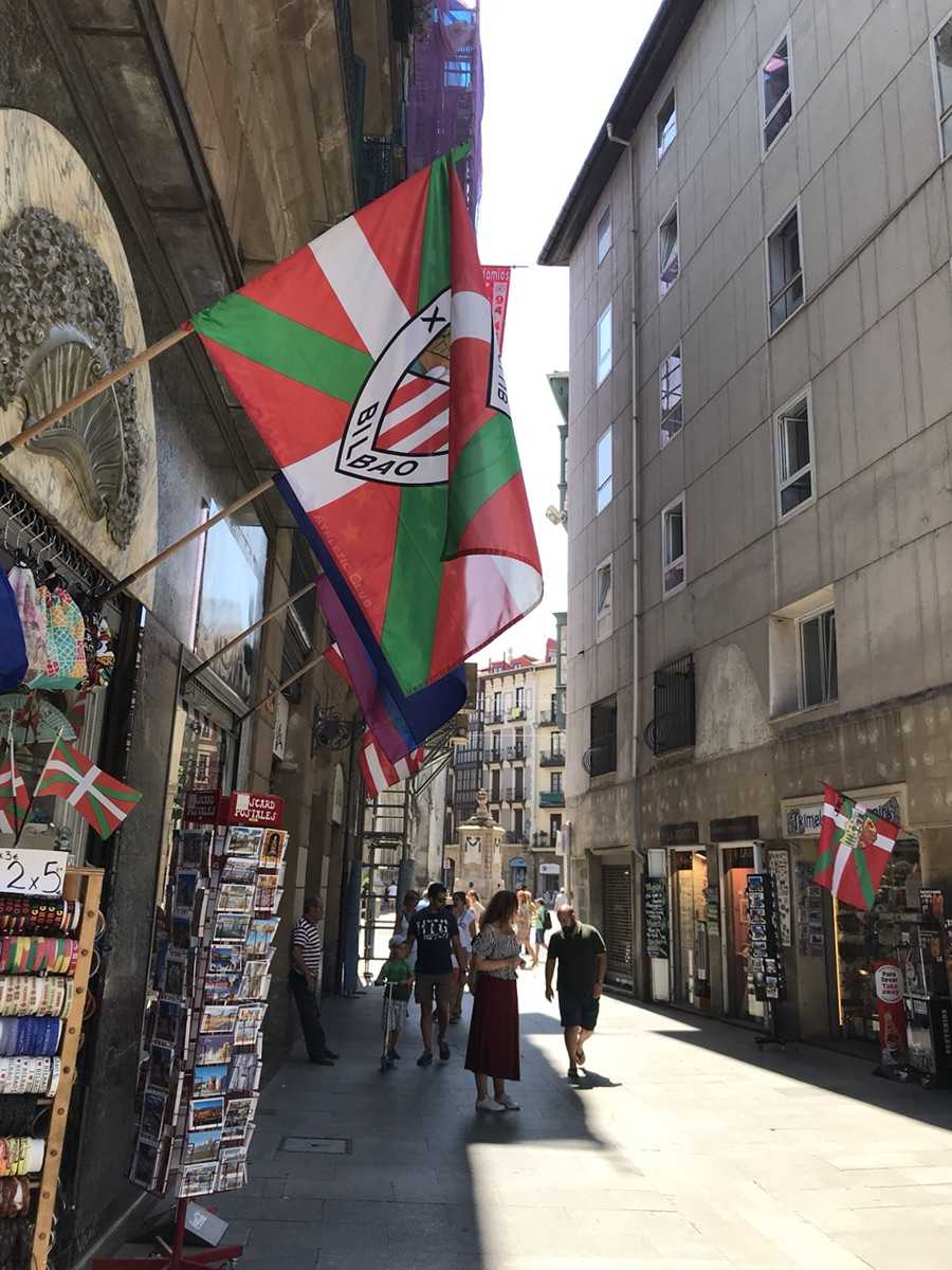 Step a little to the side and you see flags hanging above the shops. The Ikurriña, the Basque flag: red for the land of the Basque Country, the green cross of Saint Andrew for liberty and self-rule, the white cross standing for faith and justice. Created in the nineteenth century, it has long since become more than a flag — it is a declaration of identity from a people who have always insisted on walking their own path.