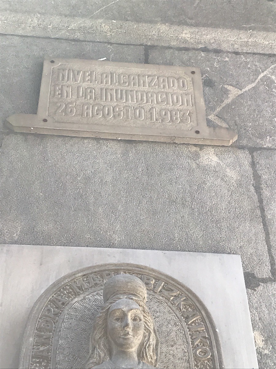 Begoña is the patroness of Bilbao and the whole region of Biscay. This little figure is a copy of the statue from the basilica on the hill, and from her niche she looks down on the old streets as if keeping watch over the people passing below. Beneath her is a marble plaque marking the height the water reached during the catastrophic flood of August 26, 1983. The old town was submerged, but the community survived — and the image of Begoña was placed here as a quiet thank-you for that survival. Walk past it today, and it still feels as if she’s holding the city in her hands.
