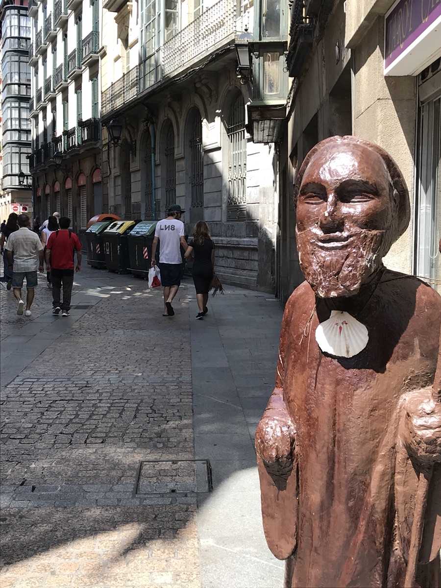 But Tendería has another layer, quieter and almost spiritual. One of the routes of the Camino de Santiago passed through this street on its way west. A scallop shell set into the pavement and a wooden figure of a pilgrim near the entrance still remind visitors of that ancient movement of people — tired, hopeful, walking toward something greater than themselves.